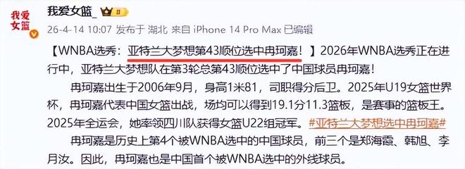 众所周知,昨天中国女篮为备战2026年国际篮联女篮世界杯及名古屋亚运会,中国篮协官宣新一轮中国女篮集训名单。这份名单一共有19人,值得一提的是,无缘入选中国女篮集训名单的一位队员,却今天在WNBA选秀大会上被亚特兰大梦想第43顺位选中。这真的有些出人意料,也引起中国球迷的热议。