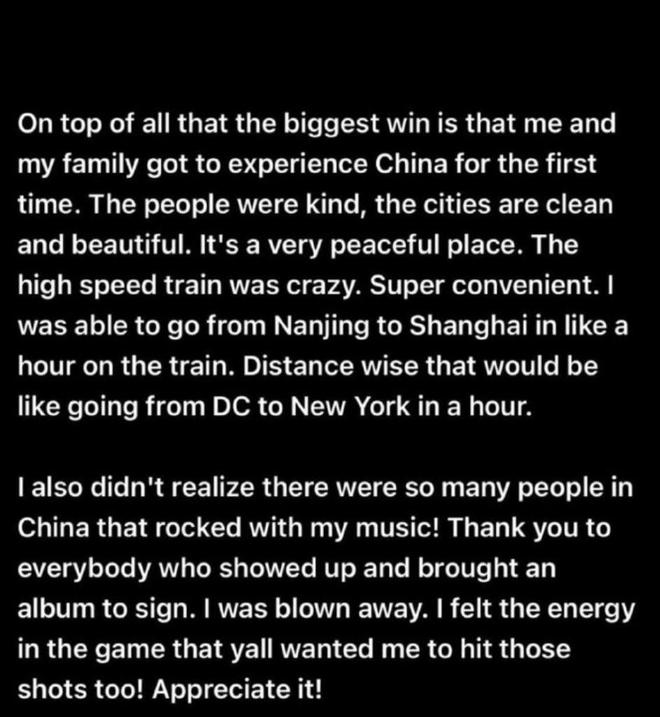 “我想感谢南京俱乐部和 CBA,让我有这样一段不可思议的经历。我也没想到中国有这么多人喜欢我的音乐!谢谢所有到场支持、带专辑来让我签名的人,真的让我很震撼”