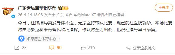 广东男篮官方发布公告写道:“今日,杜锋指导突发身体不适,无法坚持带队比赛,现已前往医院就诊。本场比赛将由助教拉科维奇暂代临场指挥。球队将全力出战,也祝杜指导早日康复。”