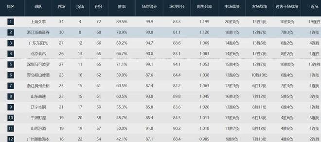 广东队目前取得27胜12负战绩排名联盟第三,仅次于上海队(34-4)和卫冕冠军广厦队(30-8),北京队26胜13负位列第四,超级黑马深圳队27胜11负第五。