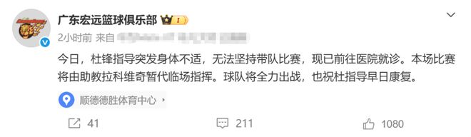 赛前广东男篮官宣主教练杜锋因突发肠胃不适,无法坚持带队比赛,现已前往医院就诊,本场比赛由助教拉科维奇暂代临场指挥。
