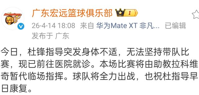 虽然很多球迷喊杜锋下课,但广东宏远显然不会这样做,然而就在主场和宁波富邦比赛前,杜锋身体出现了问题,广东宏远官方也进行了公告,拉科维奇成为临时主帅带队比赛。