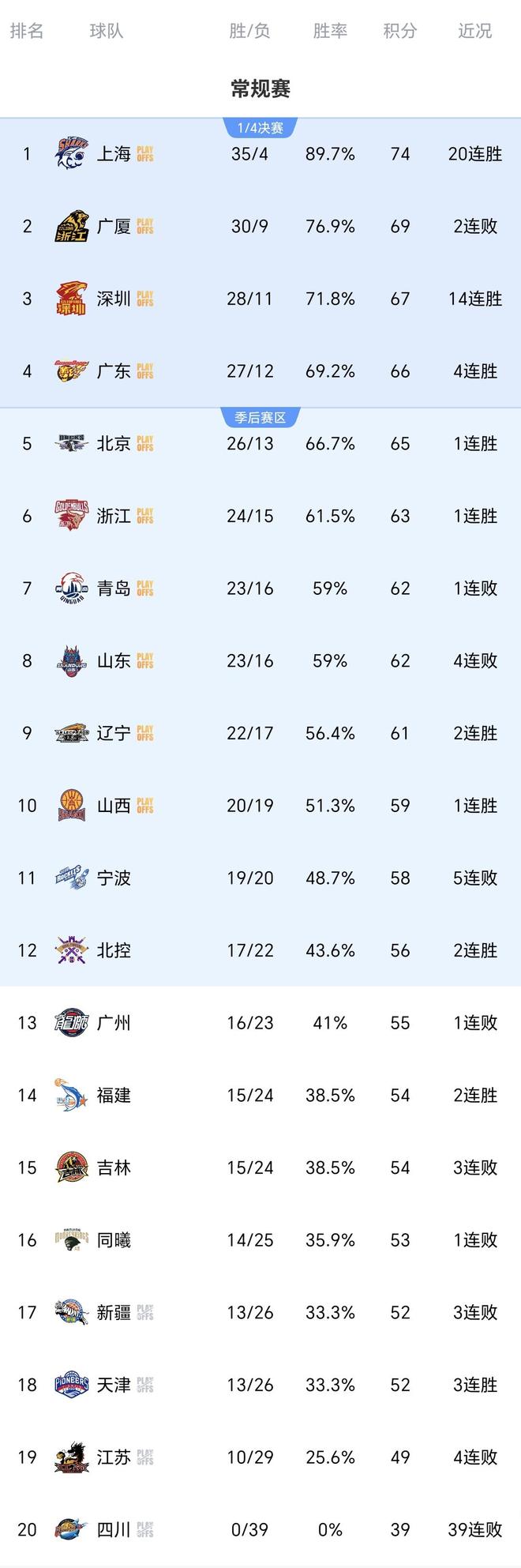 目前,上海队、广厦队、北京队、广东队、深圳队、青岛队、浙江队、山东队、辽宁队、山西队已经提前晋级季后赛,还剩下2个名额等待产生。此外,上海队、广厦队提前锁定积分榜前四,直通季后赛八强。