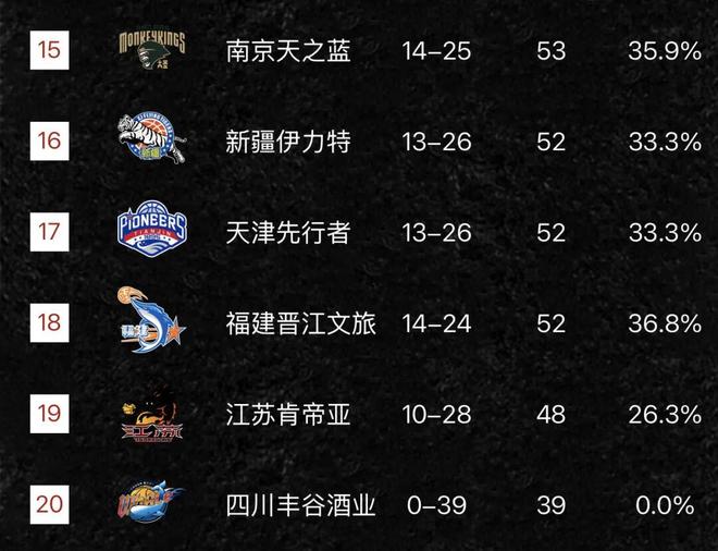 广州队第十三名,目前就是广州队和北控队来争夺最后一个进入季后赛的名额,两支球队都有可能最后时刻敲定季后赛的席位,吉林队排在第十四名,南京队排在了第十五名,新疆队排在第十六名,天津队排在第十七名,福建队排在第十八名,江苏队排在第十九名,四川队本赛季未尝一胜排在第二十名的位置!