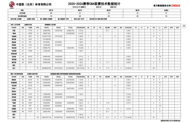 2025-2026赛季CBA常规赛第四十轮,辽宁本钢对阵浙江稠州金租的比赛于18日晚在辽宁体育馆进行,辽宁本钢队最终以71:76憾负浙江稠州金租。