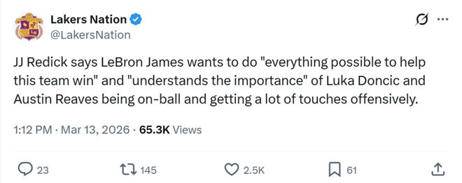 对此,赛后雷迪克称赞道:“勒布朗渴望胜利,他愿意尽一切可能帮助球队赢球,哪怕角色有所调整,在东契奇加盟后,他已经做出了不少的牺牲,但他还是明白让东契奇和里夫斯有更多持球时间的重要性,这说明了他对球队的关心程度,以及对身旁队友的重视。”