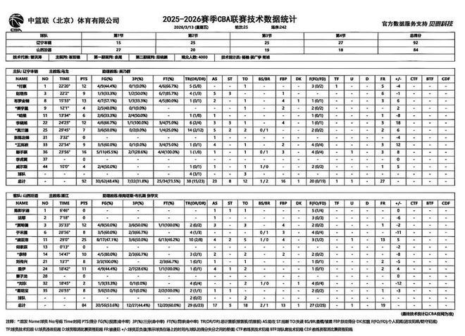 北京时间2026年3月13日19:35,2025-2026赛季CBA联赛常规赛第25轮继续进行,山西汾酒客场挑战辽宁本钢。两队历史上一共交手47次,山西汾酒17胜30负。上赛季两队交手2次,山西汾酒2胜0负;本赛季两队交手1次,山西汾酒1胜0负。本场比赛,山西队开局发挥出色,攻防两端都积极主动,多点开花,很快建立两位数领先优势。下半场未能延续出色的状态,处理球不够坚决,防守也不够明确,并且出现太多失误,最终遗憾失利,全场比赛结束,山西汾酒84:92不敌辽宁本钢。