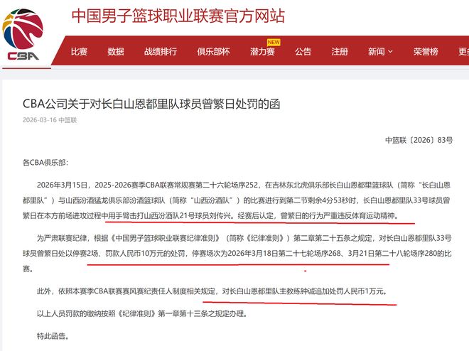 CBA公司,针对吉林队中锋曾繁日,击打刘传兴之事,开出一份大罚单!罚款100000元+停赛2场,同时,吉林队主教练钟诚也被罚款。