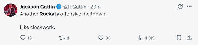 火箭记者加特林:火箭队又一次进攻崩溃了,就好像又定时闹钟一样准确无误。
