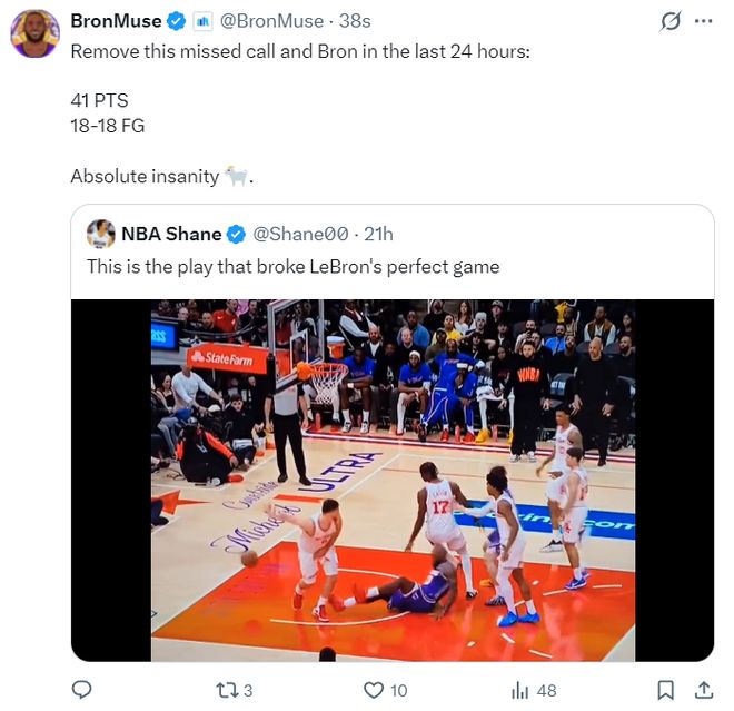 湖人媒体:如果不算申京那个犯规没有吹罚的未进球,詹姆斯在短短24小时内是一波18中18,这实在是太疯狂了,GOAT。