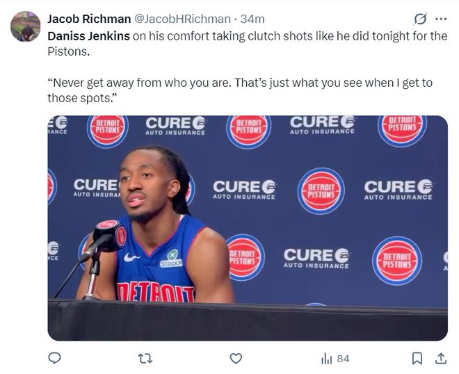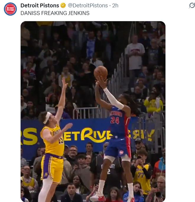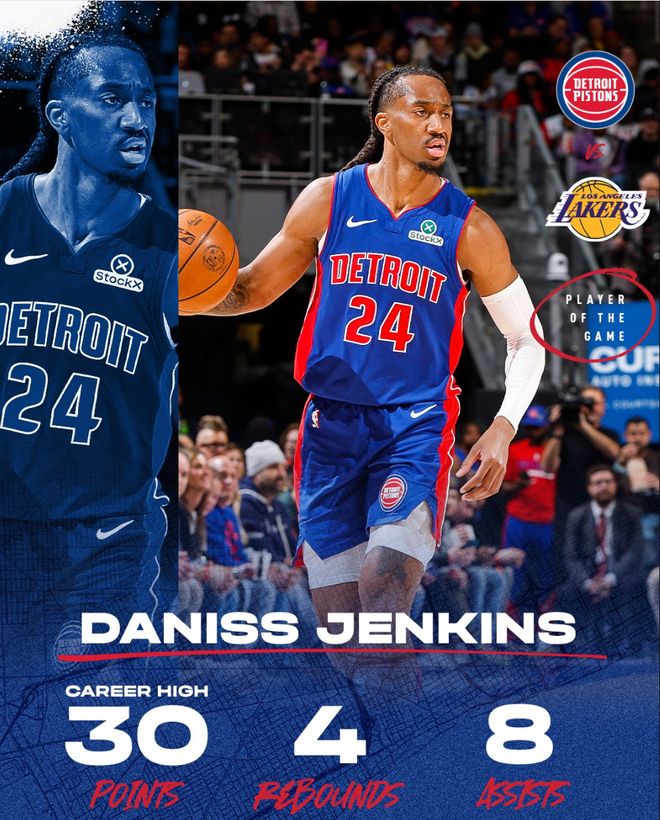 北京时间3月24日,活塞113-110击败湖人拿到4连胜。这场比赛活塞一度领先湖人16分之多,可在下半场被湖人疯狂追分,末节湖人一度反超但进入决胜时刻詹金斯这位24岁的后卫统治了比赛,决胜25秒里他一人拿到6分帮助活塞涉险过关。