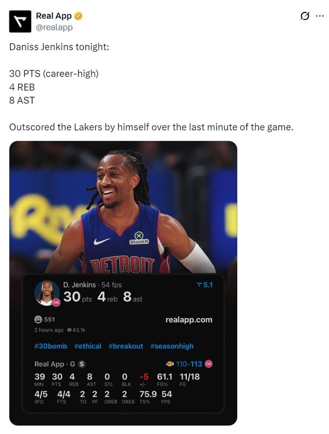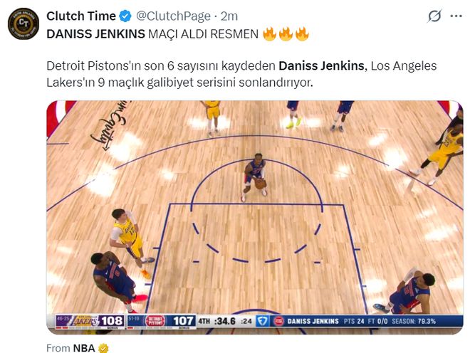 这一球命中后,东契奇终场前12秒急停中投不中,终场前9秒詹金斯控制球权后被犯规,他两罚全中领先到3分,东契奇绝平三分三不沾,终场前34秒-9秒这25秒里就是詹金斯一人大战湖人全队。
