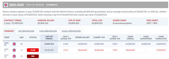 今年2月9日活塞才将詹金斯的双向合同转为正式合同,他实际上在2024年落选后就一直代表活塞出战G联赛/NBA,上赛季只打了7场比赛,但本赛季已经成为活塞核心轮换已经出战61场。本赛季薪水为380万(双年特例签约)