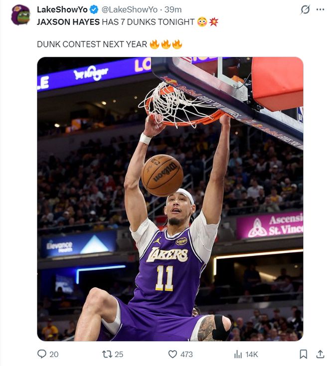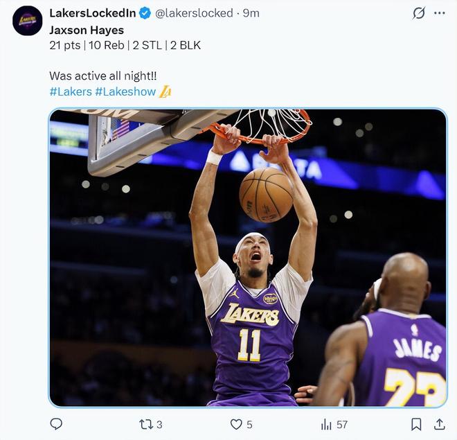 根据湖人媒体Lake Show Yo的统计这场比赛海斯足足扣篮7次,他9个运动战进球全部来自于三秒区内,他比艾顿更喜欢打挡拆顺下的战术,里夫斯、东契奇、詹姆斯三人都为他送出了空中接力的助攻。