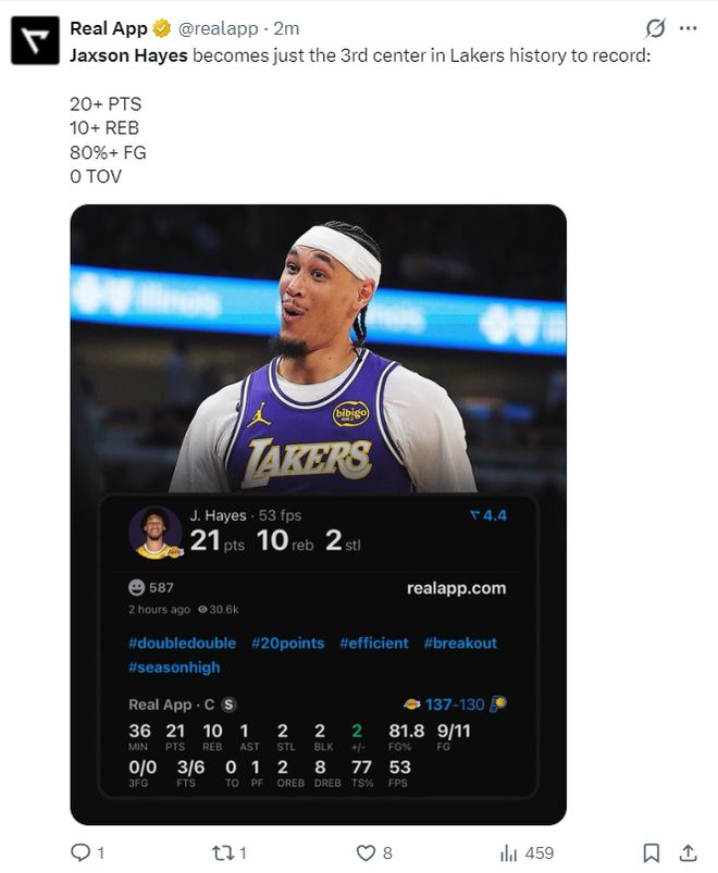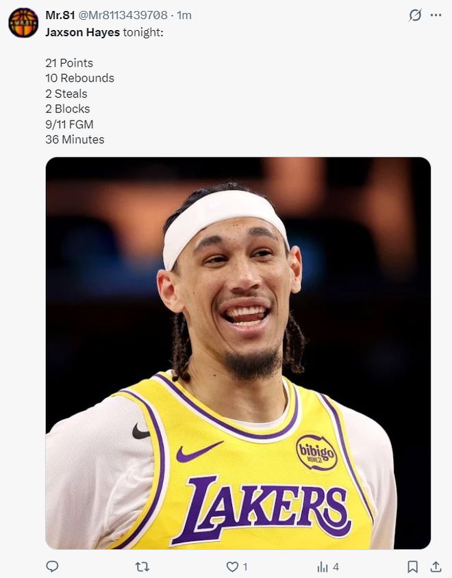 此役对于海斯来说是湖人生涯之夜:1.21分赛季新高;