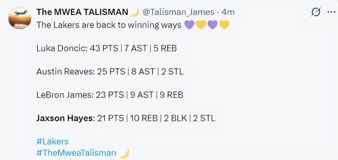 这场比赛东契奇43分7助攻6篮板,里夫斯25分8助攻,詹姆斯23分9篮板9助攻,海斯21分10篮板,只有海斯一人完成了20+10的数据。