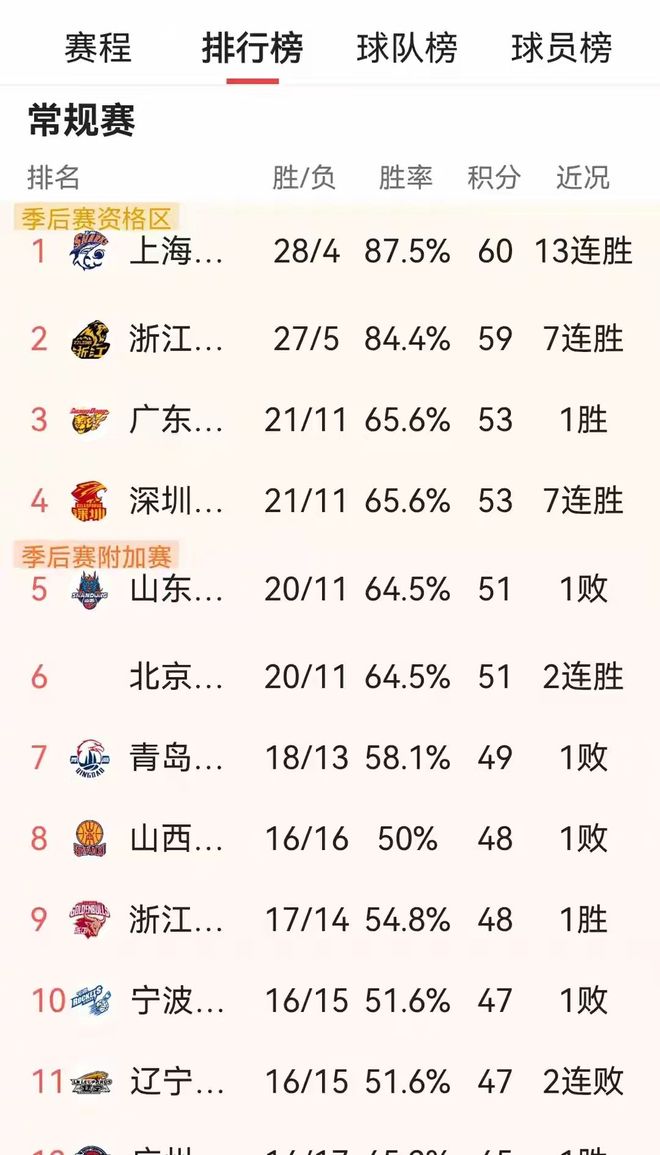 此役过后,深圳队战绩升至21胜11负,排名跃居积分榜第四位,与广东队胜场数持平,堪称本赛季最具冲击力的“现象级黑马”。