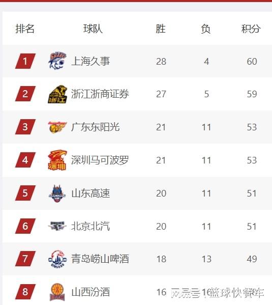 而北京队则略为尴尬,在广东队和深圳队相继赢球后,由于球队与山东队交锋上的劣势,北京队排名已经从积分榜第三名,下滑到积分榜第6名,积分榜第5名则属于山东队,他们的战绩都是20胜11负。第7名则属于青岛队,他们的战绩为18胜13负。山西队这一轮比赛虽然遗憾输球,不过,凭借着先赛一场的优势,他们还是逆袭杀回前八名,战绩为16胜16负。