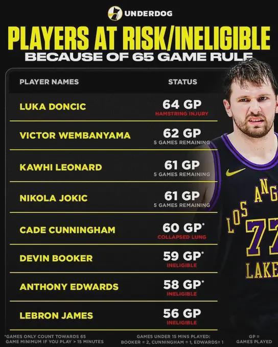 本赛季东契奇已打了64场常规赛,本来只差一场就能达到各大奖项评选标准,场均出战35.7分钟狂轰33.5分(联盟第一)外加7.7板8.3助1.6断,三项命中率47.6%、36.6%和78%,使用率36.8%同样高居联盟榜首,场均上阵时间联盟第四。