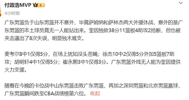 赛后媒体人付政浩谈到了这个问题,并且指出了这个致命要害:广东男篮负于山东男篮并不意外,毕竟萨姆纳和萨林杰两大外援休战,意外的是广东男篮的本土球员竟无一人能站出来。奎因独砍38分11篮板4助攻2抢断,但也被夹击逼出了8次失误,明显独木难支。