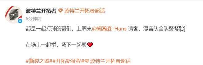 杨瀚森本赛季在开拓者没有得到太多锻炼机会,是在混音获得更多时间,并通过训练比赛有所提升。混音主帅也很喜欢瀚森,多次夸奖瀚森进步明显。他也出现在这次聚餐的画面里。
