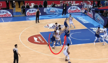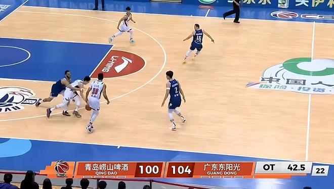 比赛最后45秒钟,青岛男篮100-104落后,这时候是广东男篮的球权,两队犯规都已经4次满额,犯规就要罚球。
