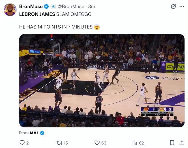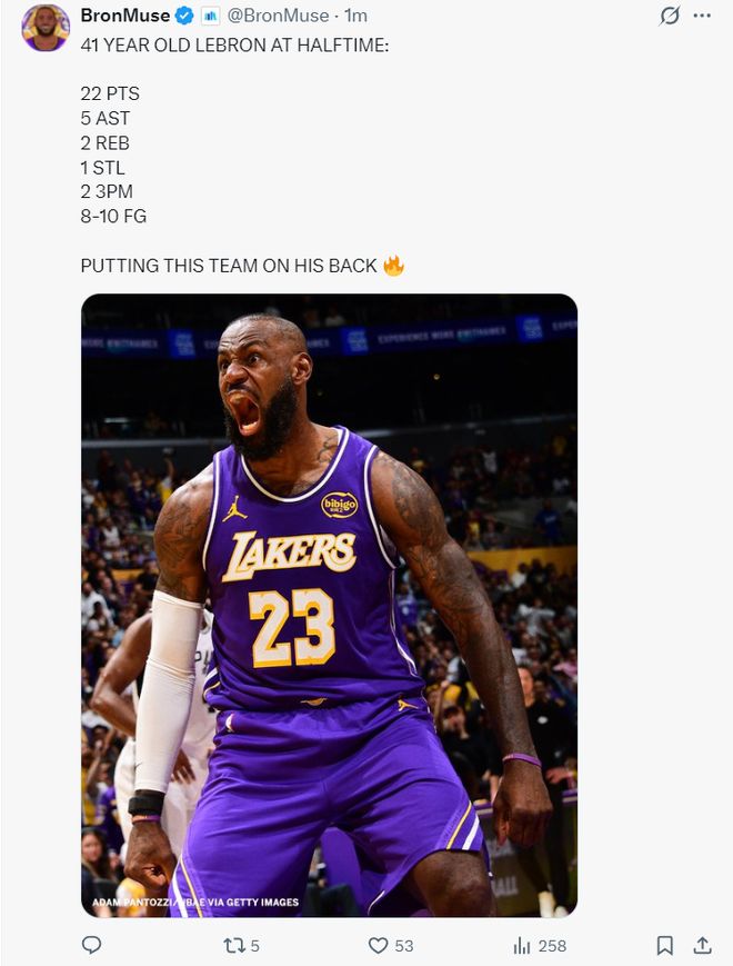 第二节开场太阳打出12-2直接完成反超,雷迪克暂停后还是41岁的勒布朗将球队扛了起来,他单节6中4拿到8分1篮板,各种的突破与翻身跳投,上半场打完詹姆斯10中8+三分2中2拿到22分5助攻2篮板1抢断,命中率80%,他帮助湖人再度建立9分的优势。湖媒:把这支球队放心交给他。