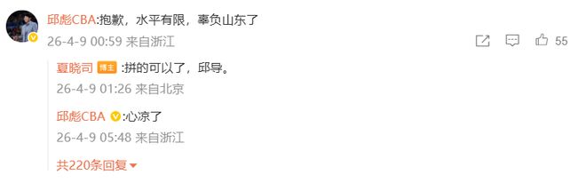 山东队现在有点要崩的意思,克里斯手指骨折长期缺席,新来的外援没能打出身价,球队近期战绩也是起伏很大,和强队的比赛只赢了广东一场,其余全输,期间还惨败宁波30分,上一轮输给广厦后,邱彪是一夜未眠,凌晨时分现身社媒回复媒体人喊话山东球迷:抱歉,水平有限,辜负山东了,心凉了。