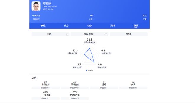 陈盈骏本赛季效力于北京男篮,场均数据12分5助攻3篮板左右,三分球命中率能保持在42%左右,是一名攻防稳定的全能型后卫。