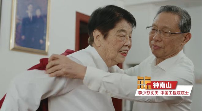 李少芬丈夫钟南山亲手为妻子穿上“名人礼服”,并说道“很不容易啊,能够穿上这个衣服”“这样挺好看的”“很少见到你那么兴奋,那么高兴,也是我们家的一个光荣。”