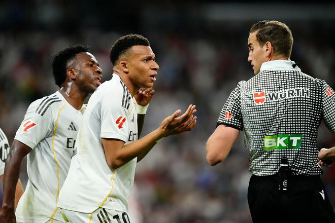 可周五发生的事,根本无从辩解。他明明看到了球员身上的血迹,却视若无睹。上半场,一次情节更轻微、甚至没有造成身体伤害的动作,他二话不说就吹了姆巴佩犯规,还掏出了黄牌。但面对法国人遭遇的那个明显的点球争议——维托尔-雷斯的肘击就发生在他眼皮底下——他却立刻摆手示意没有犯规。随后他凑到耳机旁,而特鲁希略居然说出了“继续!”这种荒唐的话。西甲联赛还出来为他们辩解,声称所有镜头都没拍到血迹。照这么说,从今往后,吹罚这种显而易见的点球,要么得见血,要么就当没看见……除非你穿的不是皇马的白色球衣。