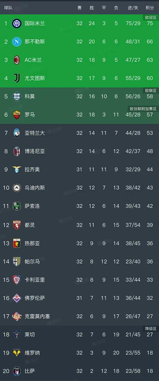 北京时间4月13日,随着国米4-3险胜科莫的比赛结束,意甲第32轮已经结束了9场比赛,我们看看最新积分榜变动!