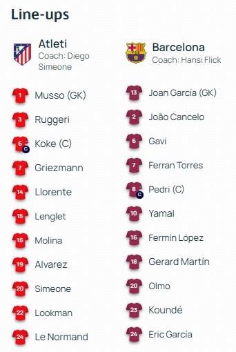 北京时间4月15日3:00,欧冠1/4决赛次回合,马竞坐镇利雅得航空大都会球场迎战巴萨,本场主裁判为蒂尔潘,首回合马竞客场2-0巴萨,赛前双方首发出炉。
