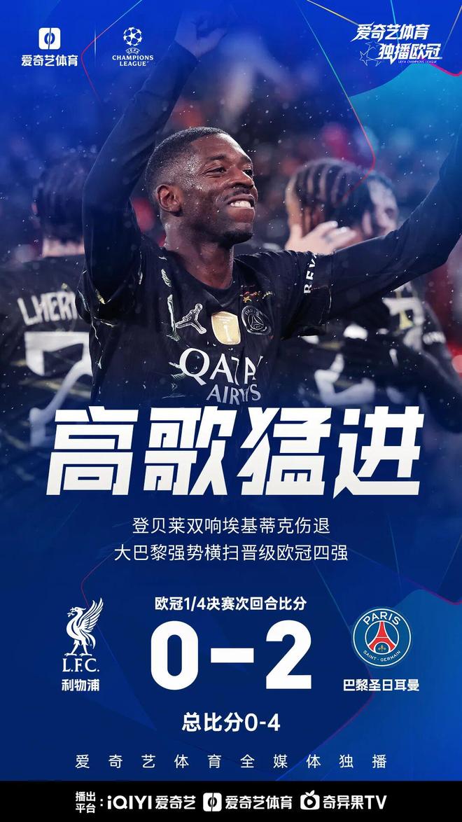 下半场,登贝莱世界波远射破门,随后禁区内接到巴尔科拉传球推射破门完成梅开二度,最终利物浦0-2巴黎,总比分0-4,巴黎圣日耳曼顺利晋级!