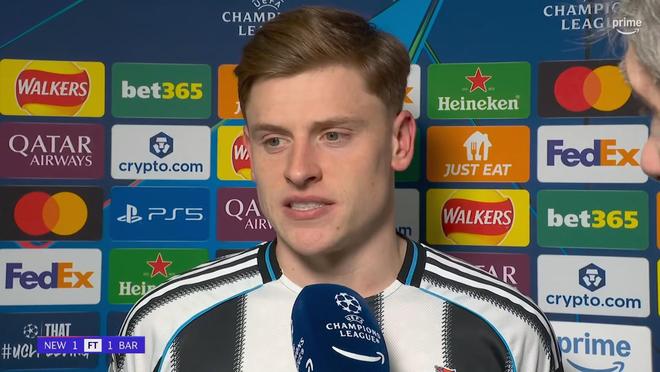 在欧冠1/8决赛首回合打进一球帮助纽卡斯尔联主场1-1战平巴塞罗那之后,哈维-巴恩斯接受了来自亚马逊Prime Video的采访。