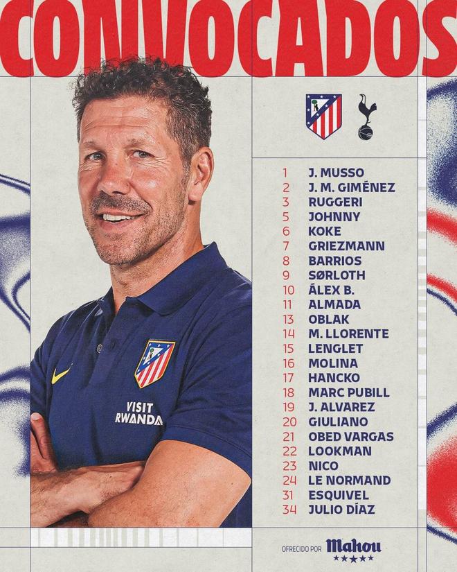 马竞主场战热刺大名单如下: