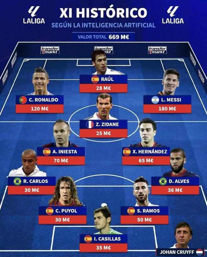 最近德国转会市场西班牙站整理了“西甲历史最佳阵容”。名单把前场的C罗、劳尔、梅西直接摆在一起,中场则是齐达内、哈维、伊涅斯塔这种控球与创造力拉满的组合。与此同时,迪斯蒂法诺、普斯卡什、罗纳尔迪尼奥并不在名单里。可仔细看阵容名单,两名边后卫都以压上见长,而中场三人偏组织与控球,这套阵容真要踢强强对话,进攻会有多夸张,防守会不会被反击一打就穿?(数据截至2026年2月24日)