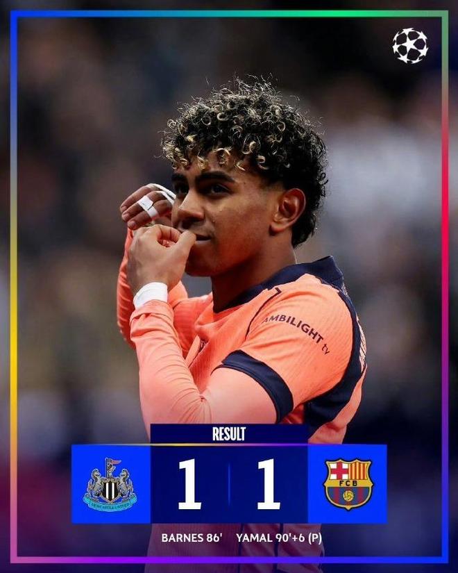 纽卡这场最可惜,也是最有血性的。巴恩斯第86分钟的进球让圣詹姆斯公园球场陷入疯狂,眼看着就要掀翻西甲豪门。结果读秒阶段,19岁的亚马尔站了出来,上演点球绝平好戏。喜鹊从三分到一分,这心理落差,比直接输球还难受。但不可否认,纽卡是英超6强当中,表现最好的一支球队。