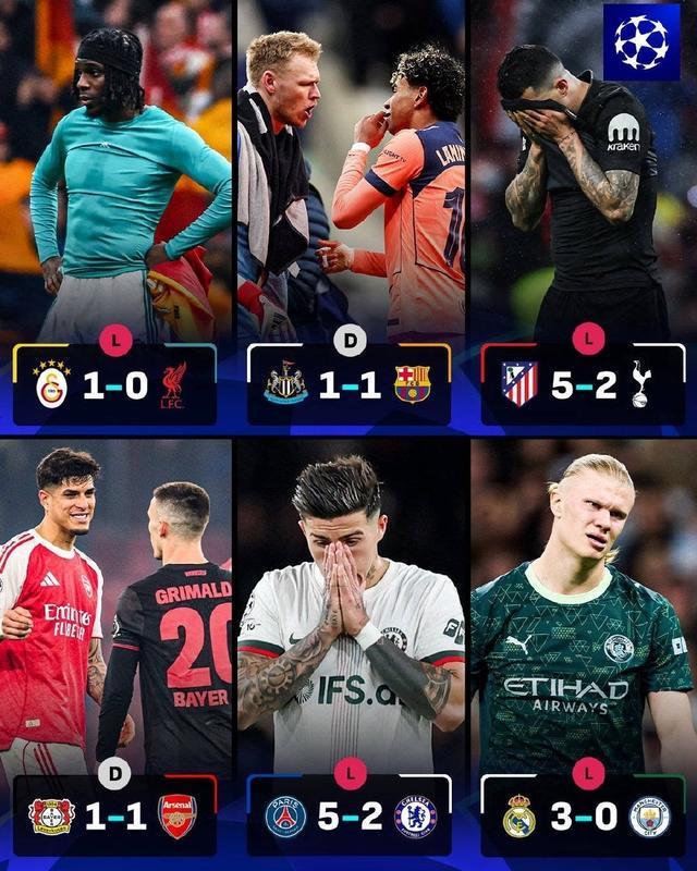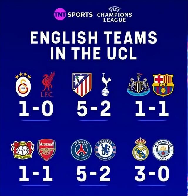 先来看欧冠赛场,利物浦0-1爆冷输给加拉塔萨雷、热刺2-5惨败不敌马竞、纽卡1-1遭巴萨绝平、阿森纳1-1绝平勒沃库森、切尔西2-5惨败输给巴黎、曼城0-3遭皇马横扫。