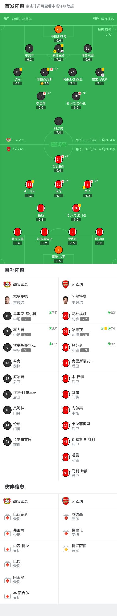 第74分钟,哈弗茨登场战旧主,哲凯赖什被换下