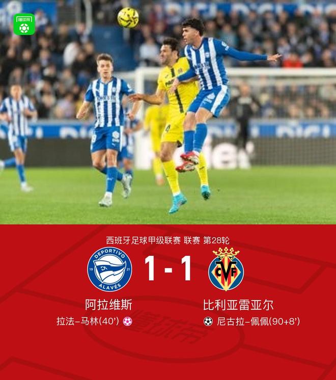 北京时间3月14日西班牙足球甲级联赛 联赛 第28轮,阿拉维斯主场对阵比利亚雷亚尔。比利亚雷亚尔尼古拉-佩佩破门,拉法-马林自摆乌龙。最终比分阿拉维斯 1-1 比利亚雷亚尔。