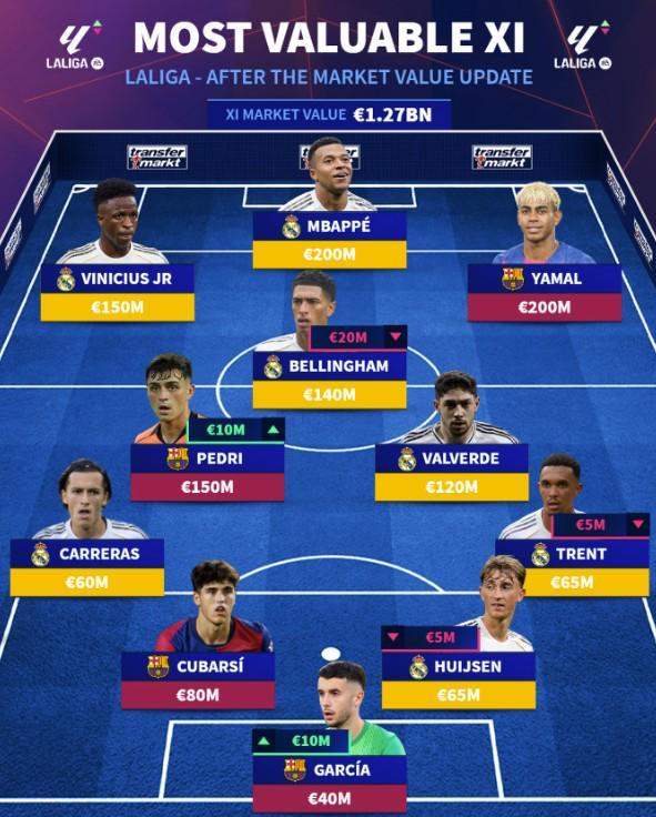 西甲最贵阵容十一人全部来自于皇马和巴萨,其中皇马七人,巴萨四人。锋线上是维尼修斯、姆巴佩和亚马尔,中场则是贝林厄姆、佩德里和巴尔韦德,后防线上是卡雷拉斯、库巴西、赫伊森和阿诺德,门将位置上则是霍安-加西亚,这套阵容的总身价为12.7亿欧元。