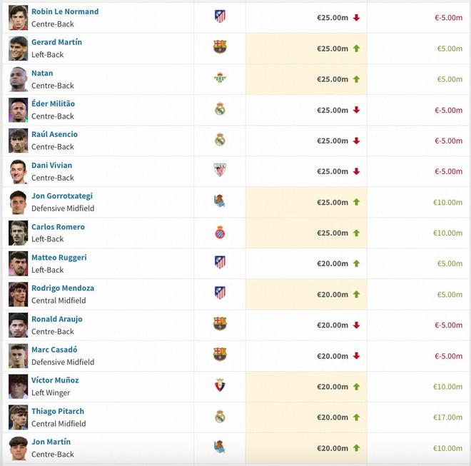 姆巴佩与亚马尔身价没有变动,依然是2亿欧,并列西甲榜首,维尼修斯身价1.5亿欧并列第三。