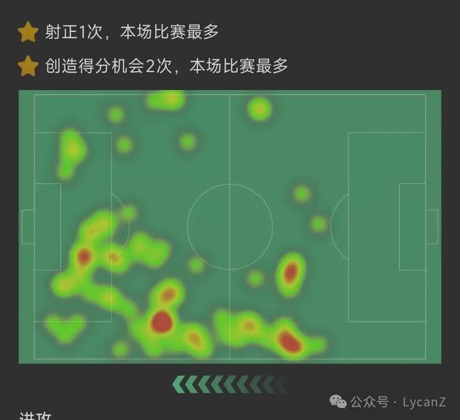 ↑例如22′45″无球前插,抢在伊萨克森身前完成冲顶偏出。
