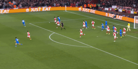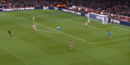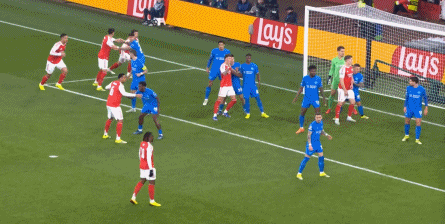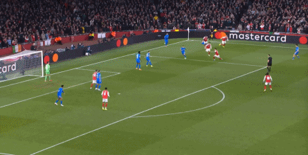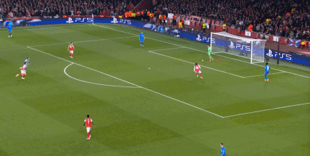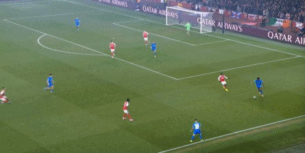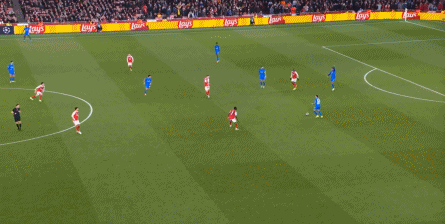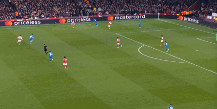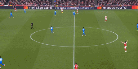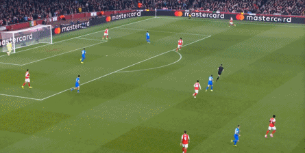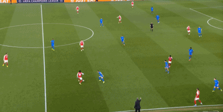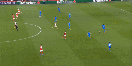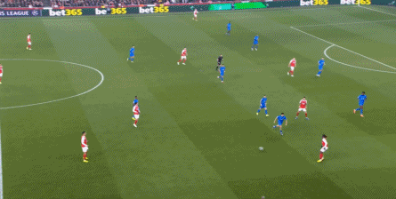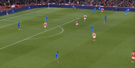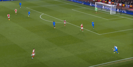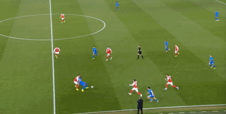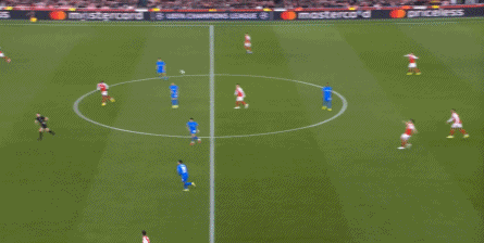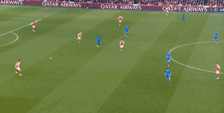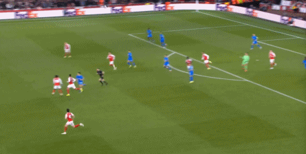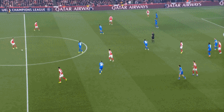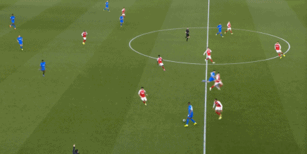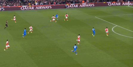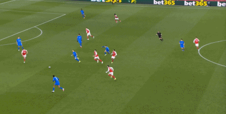 但是,随着队形的向前,三线的距离就会变得难以保持,这是面对比分落后的球队最难以处理的问题,也是比分领先的球队需要把握的机会,所以到了下半场,阿森纳依然可以通过长传球打进两线之间,从而衔接射门: