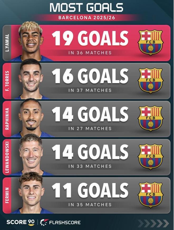 只盯着亚马尔,也会把这组数据看窄了。进球榜第二的是托雷斯,37场16球,说明他这赛季在门前把握机会的效率很高。巴萨官方在去年12月就专门写过他,当时他已经在联赛打进11球,而且只用了15场,速度比上赛季更快。进球榜上还有拉菲尼亚和莱万,两人都是14球。拉菲尼亚27场就做到14球,效率很高,但他赛季中途有过伤病影响,2月中旬才重新参加部分合练,这也影响了他继续往上追的节奏。莱万虽然同样有14球,但这组三榜里他只出现在进球榜,没有进入助攻榜和参与进球榜前五,说明他更多还是终结点的角色。