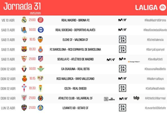 西甲第31轮开球时间(北京时间)