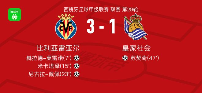 北京时间3月21日西班牙足球甲级联赛 联赛 第29轮,比利亚雷亚尔主场对阵皇家社会。比利亚雷亚尔赫拉德-莫雷诺破门,米卡塔泽破门,尼古拉-佩佩破门。皇家社会苏契奇破门。最终比分比利亚雷亚尔 3-1 皇家社会。