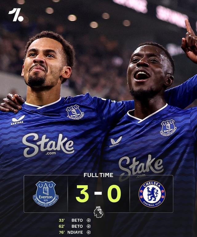 全场战罢,埃弗顿主场3-0大胜切尔西,拿下自1987年以来对阵切尔西的最大比分胜利,2球1助的贝托当选全场最佳球员!