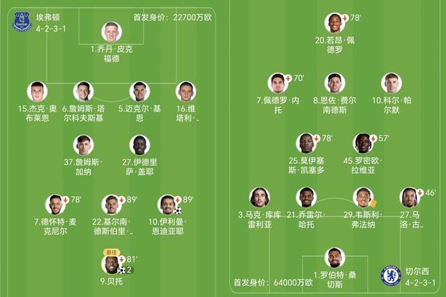 埃弗顿用简单高效的反击三次洞穿蓝军大门,蓝军全场控球占优却转化乏力,面对状态出色的皮克福德毫无办法,攻防两端可谓全面失衡。